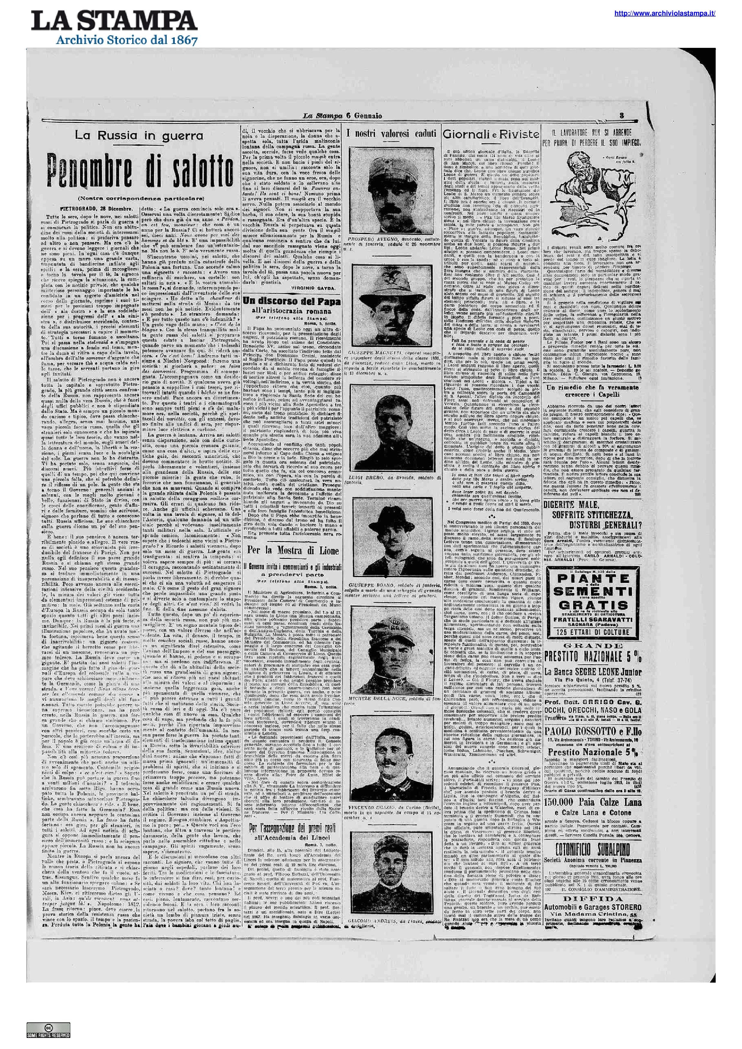 Su La Stampa, Virginio Gayda scrive della Pietrogrado bene, dei suoi salotti buoni, della sua nobiltà, o altissima borghesia: «Il vero russo dell’alta società è uno sciovinista più irriducibile del francese di Parigi. Non per caso definisce il suo Paese non la Russia, ma la Grande Russia». La guerra lo ha toccato di striscio, magari è solo un po’ contrariato dalle serate a teatro: «Gli spettacoli devono finire alle undici di sera per risparmiare luce elettrica e carbone».