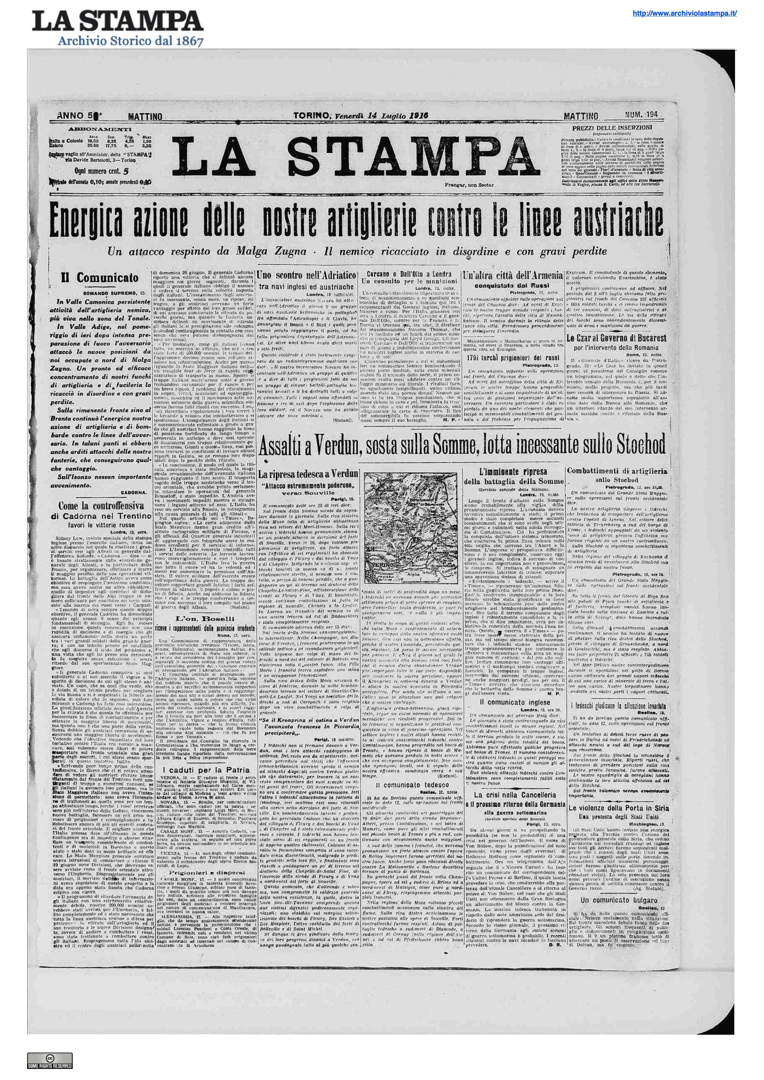 In Valle Camonica crescente attività dell' artiglieria nemica contro le nostre posizioni del Tonale e sull' Adamello. Nella zona di Valle Adige la nostra artiglieria colpì batterie nemiche sulle pendici del Biaena e colonne di truppe e carreggi in marcia. Sulla fronte del Posina fu respinto un contrattacco nemico su Monte Majo. Sull' Altopiano dei Sette Comuni vivaci azioni di artiglieria e di fanteria. Nella zona della Tofana il nemico, annidato su un erto torrione roccioso ad est di Col dei Bois, chiamato il «Castelletto» dominava la via delle Dolomiti e la testata del Vallone di Travenanzes. Una grandiosa mina scavata con tenace diuturno lavoro, fu fatta brillare nella notte sul 12. La sommità del «Castelletto» saltò in aria seppellendo sotto le rovine l' intero presidio nemico. Scalate le ripide pareti del torrione, i nostri alpini occuparono e saldamente rafforzarono la posizione. La notte sul 13 il nemico raccolte nuove forze e coll' appoggio di nuove batterie, attaccava il «Castelletto». Dopo aspra mischia fu respinto con gravissime perdite. Tutto ieri durò accanito, rabbioso il fuoco delle artiglierie nemiche contro la posizione, senza per altro scuoterne la salda resistenza. Sulla rimanente fronte sino al mare attività di artiglieria. Velivoli nemici nella passata notte lanciarono bombe su Padova: due morti, pochi feriti e lievi danni.