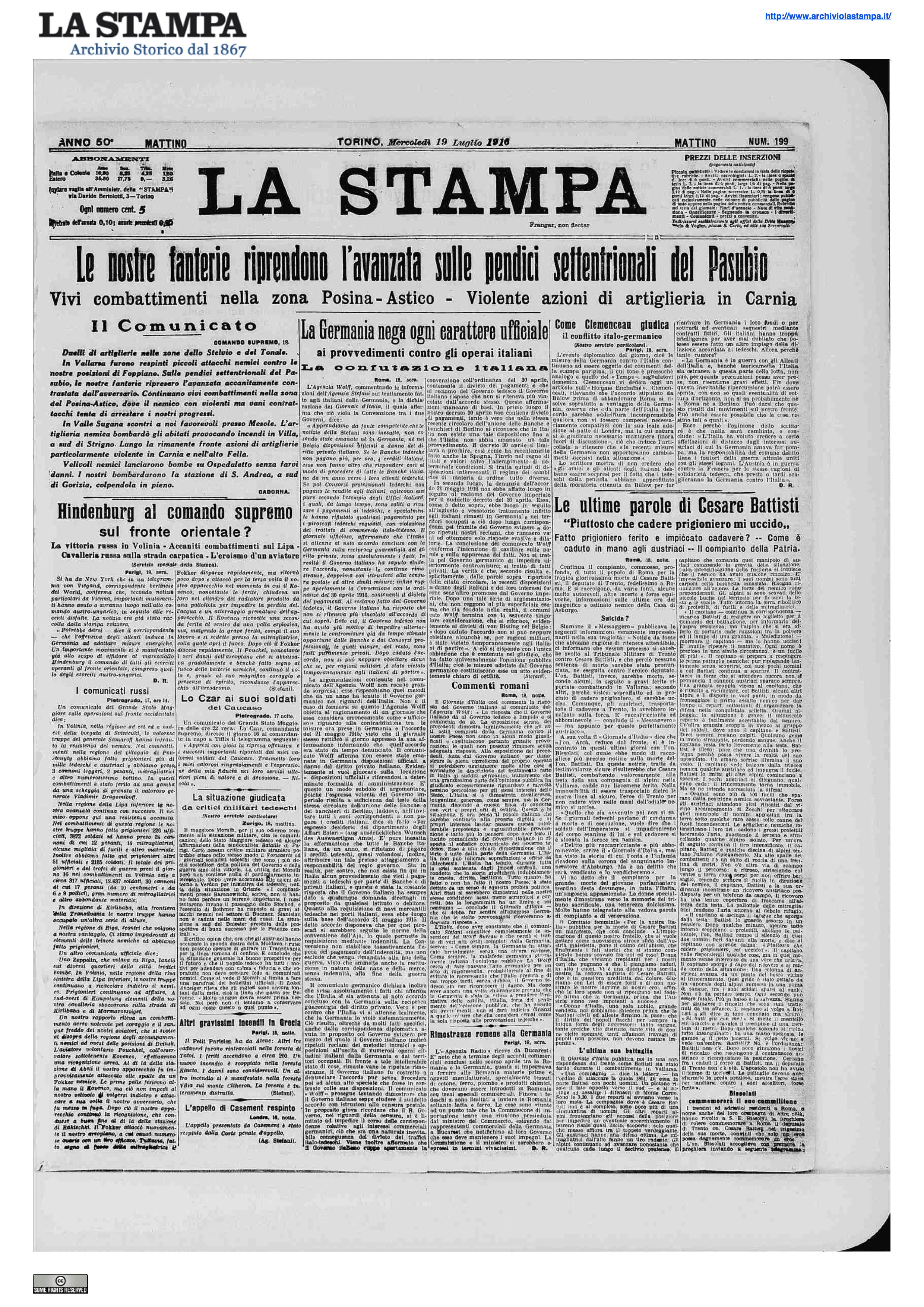 Nell' alto Posina ieri, dopo preparazione delle artiglierie, le nostre truppe ripresero attacchi sulle pendici del Corno del Coston; le batterie nemiche, rimaste silenziose durante il nostro bombardamento, iniziarono raffiche di fuoco intenso e celere; tuttavia le nostre fanterie riuscirono ad impadronirsi di nuove posizioni sull' impervio e roccioso declivio del monte.