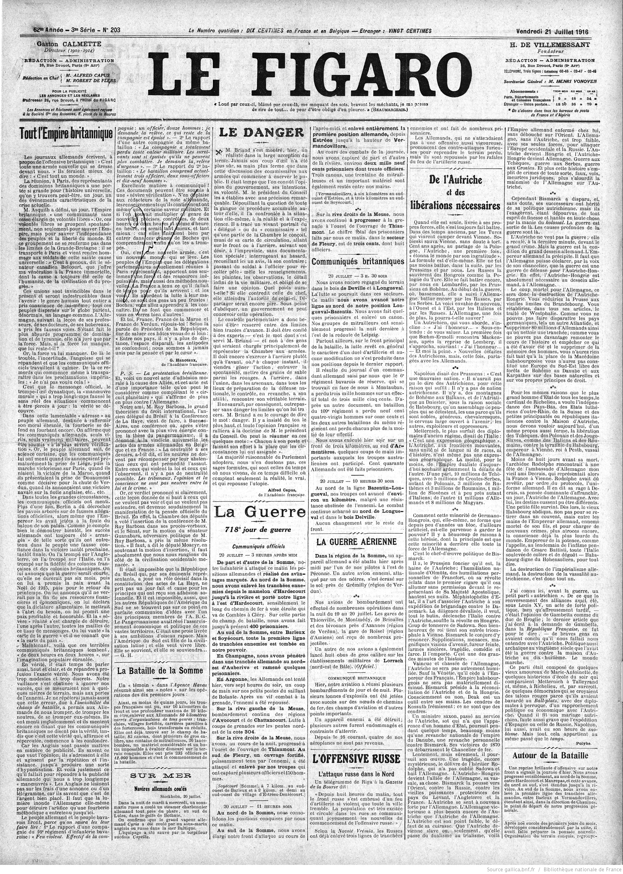 In Germania la Frankfurter Zeitung riassume la situazione: «Su tutti i fronti si combatte. La posizione dei tedeschi non è piacevole, ma tengono fermo in tutte le linee principali». Sulla Somme i britannici si trascinano a fatica nel bosco di Foureaux, a nord della linea Bazentin-Longueval, ma, contrattaccati, devono ridurre le pretese. Intanto i francesi rintuzzano alla baionetta azioni tedesche a Soyécourt e a sud di Chaulnes.