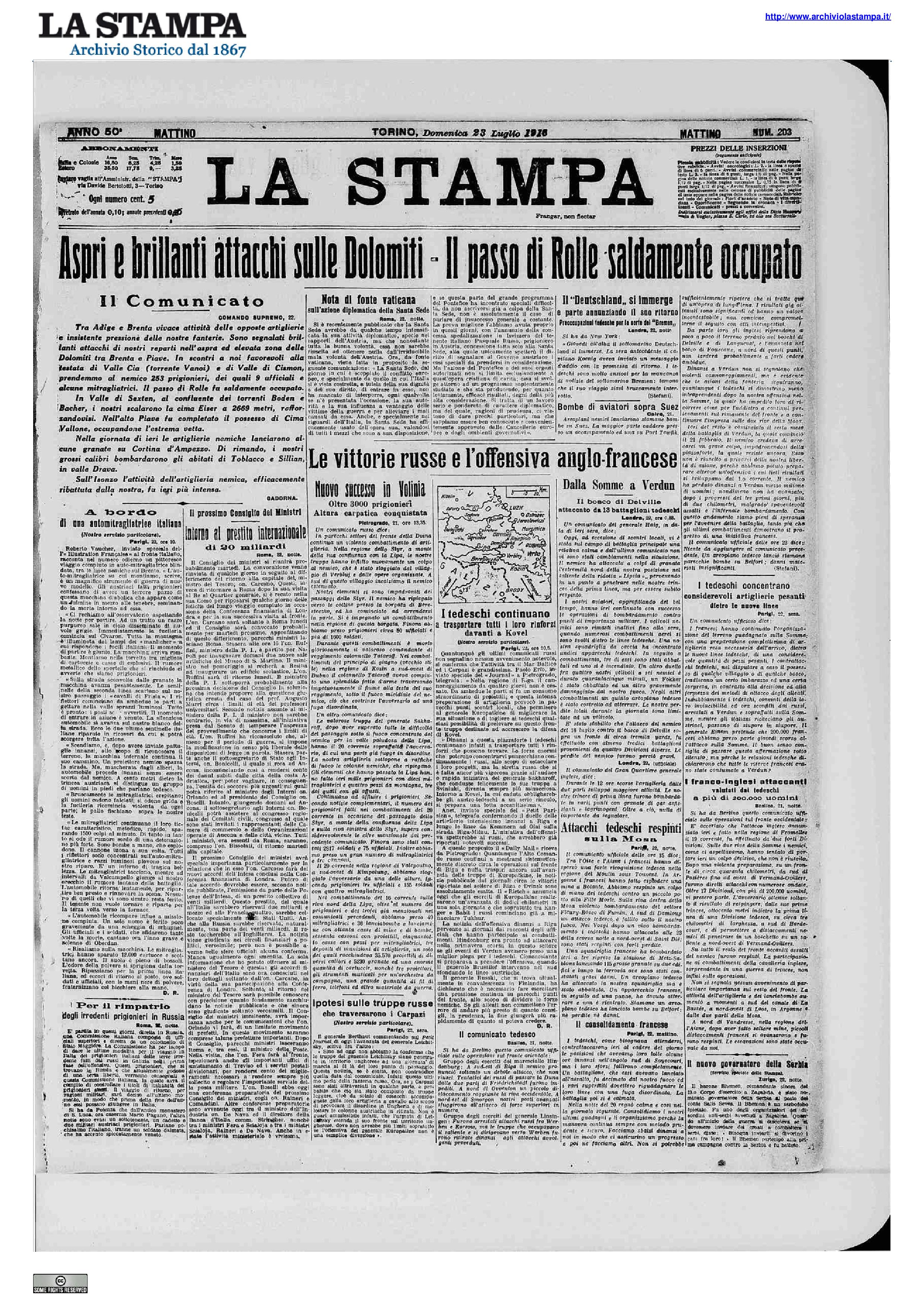In Valle Lagarina intensa azione delle artiglierie. Quella nemica tirò anche su Avio, danneggiandone l' ospedale civile. Di rimando i nostri grossi calibri rinnovarono il bombardamento di Riva, Nago e Rovereto, provocandovi incendi. Sulla fronte del Posina e sull' Altipiano dei Sette Comuni continuò la pressione delle nostre fanterie con qualche progresso sulle pendici di Monte Zebio, ove un brillante attacco di nostri bersaglieri espugnò un trinceramento esteso 300 metri e prese al nemico 120 prigionieri ed una mitragliatrice. Nella regione delle Dolomiti, tra le testate delle Valli Travignole e Cismon i nostri conquistarono le forti posizioni della Cavalazza (2326 m.) e di Colbricon (2604 m.) prendendo al nemico 142 prigionieri dei quali 3 ufficiali, 2 cannoni, alcuni lanciabombe e ricco bottino di armi e munizioni. Nell'Alto Boite l' artiglieria nemica lanciò altre granate su Cortina d' Ampezzo. La nostra rispose bombardando di nuovo Toblacco e Sillian, aprendo il fuoco anche su Innichen. Sulla rimanente fronte nessun importante avvertimento.
