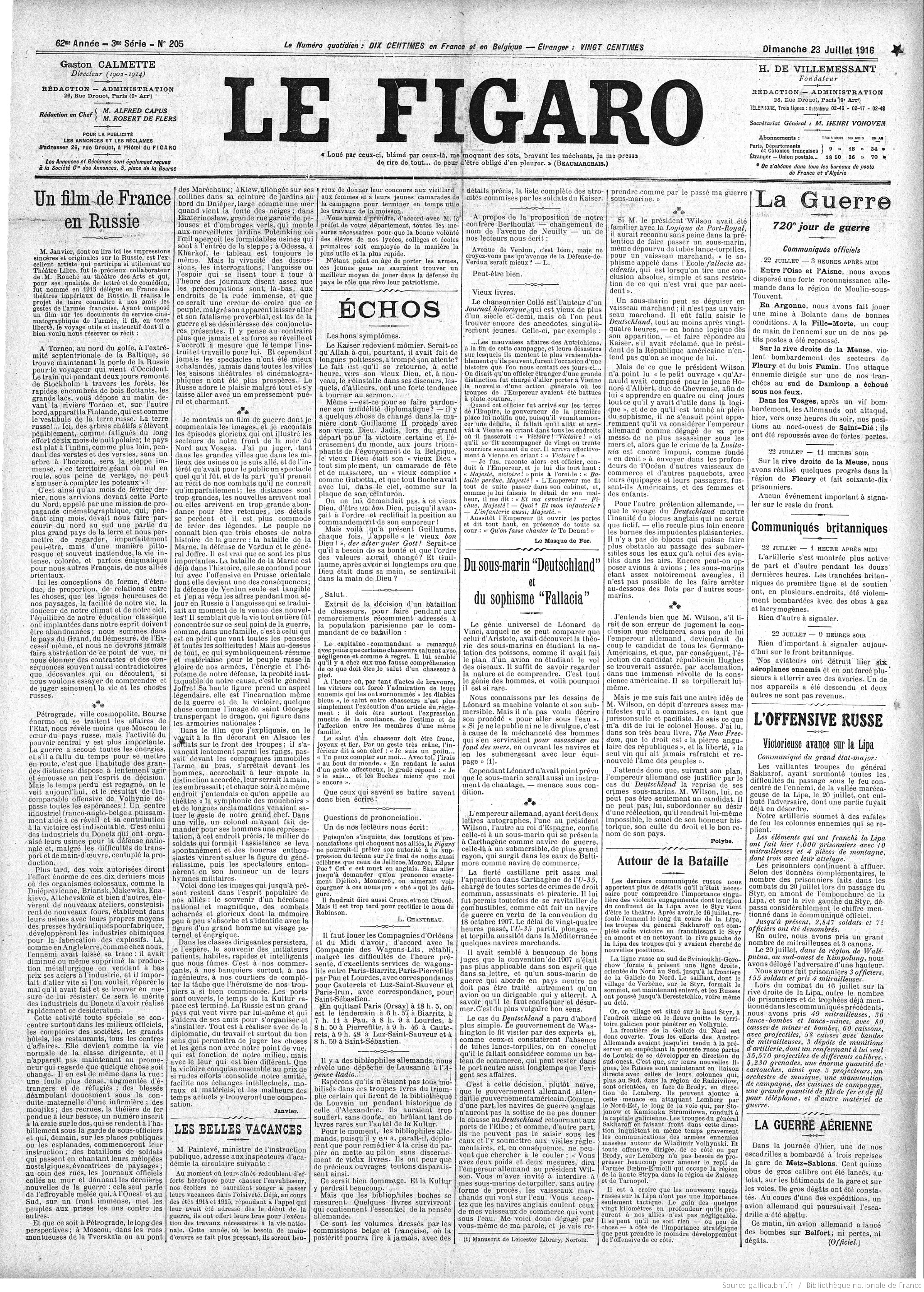 Sul fronte occidentale la battaglia di Pozières apre la seconda fase dell’offensiva sulla Somme. Britannici e australiani hanno il compito di impossessarsi della collina, a qualunque costo. Poco più a est Longueval e Guillemont cambiano di mano più volte nella stessa giornata. L’opposizione tedesca è di una veemenza ferina, i frenetici corpo a corpo «imbevono il terreno di sangue».