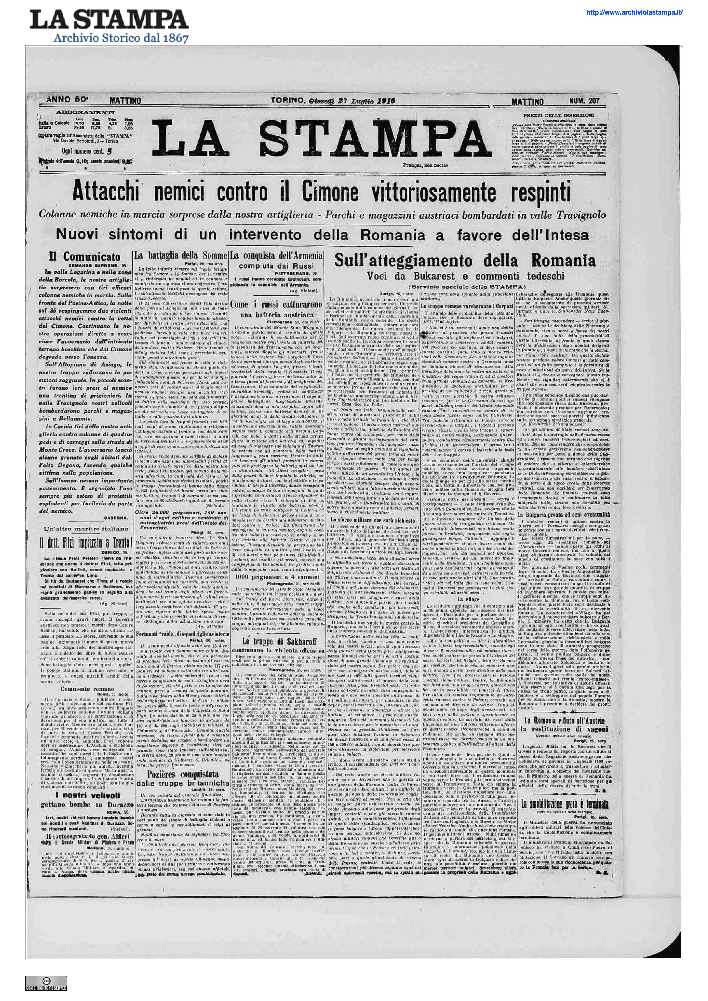 Nella giornata di ieri in vari tratti della fronte l' artiglieria nemica si accanì nel battere a scopo di distruzione i centri abitati. Si ebbero bombardamenti di alcune località nella conca di Asiago, nelle valli del Boite e del Degano e nel piano del Basso Isonzo: pochi danni e qualche vittima nella popolazione. In Vallarsa ed alla testata del Posina la notte sul 26 furono respinti tentativi di attacco nemici contro le nostre posizioni sulla riva destra del torrente Leno e sulle pendici di Corno del Coston. Sull' Altipiano di Tonezza l' avversario, fortemente trincerato nei boschi a nord di Monte Cimone, oppone tenace resistenza all' avanzata delle nostre truppe. Tuttavia anche ieri fu ad esse possibile di compiere qualche progresso. In Valle Travignolo attività delle artiglierie nemiche contro le posizioni da noi recentemente conquistate. Sulla rimanente fronte situazione immutata.
