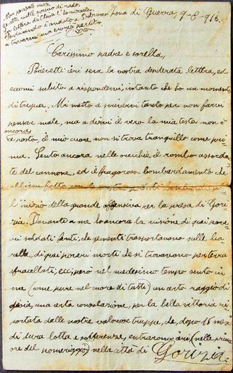 Ricevetti ieri sera la vostra desiderata lettera, ed eccomi subito a rispondervi, intanto che ho un momento di tregua. Mi metto a scrivervi tanto per non farvi pensare male, ma a dirvi è vero la mia testa non è ancora a posto, il mio cuore non si trova tranquillo come prima. Sento ancora nelle orecchie il rombo assordante del cannone, ed il fragoroso bombardamento che abbiamo fatto con le nostre potenti bombarde all’inizio della grande offensiva per la presa di Gorizia. Davanti a me ho ancora la visione di quei poveri soldati feriti, che gementi trasportavano sulle barelle, di quei poveri morti che si trovavano per terra sfracellati, ecc; però nel medesimo tempo sento in me (come pure nel cuore di tutti) un certo raggio di gloria, una certa consolazione, per la bella vittoria riportata dalle nostre valorose truppe, che, dopo 15 mesi di dura lotta e sofferenze, entrarono (nelle prime ore del pomeriggio) nella città di Gorizia.