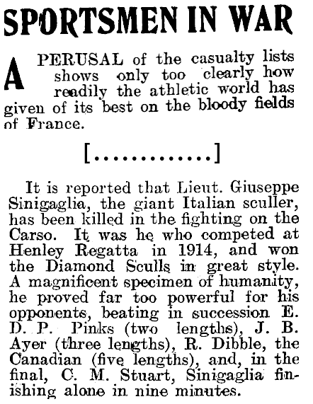 Vienna si “vendica” bombardando Venezia, tra le “vittime” c’è la chiesa di Santa Maria Formosa, un gioiello. Al fronte gli austro-ungarici lanciano un contrattacco sul San Michele: il possesso della cima resta nostro, ma tra i caduti c’è Giuseppe Sinigaglia, un’altra eccellenza del nostro sport. Due metri scarsi per un centinaio chili, canottiere, vincitore dell’edizione 1914 della Diamond's Sculls, all’epoca la più prestigiosa regata al mondo.