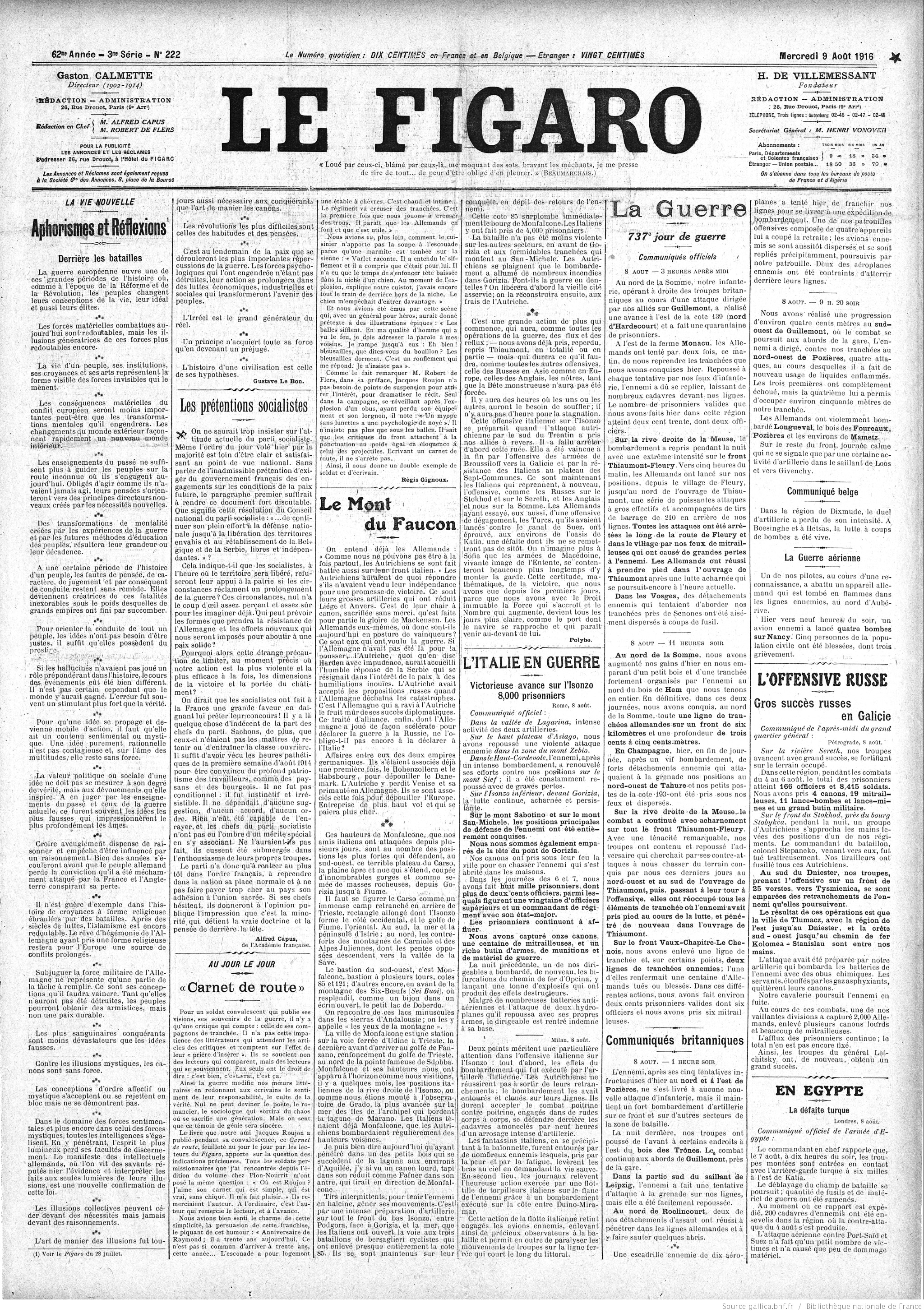 «Il tricolore sventola sull’abbandonata Gorizia», territorio asburgico da circa 400 anni, salvo la breve parentesi napoleonica. Riparati i ponti sull’Isonzo, il 9 agosto la città è ormai conquistata dagli italiani; ci sono voluti un anno di tentativi vani. Sono stati tre giorni di combattimenti intensi, il bottino è ricco, i prigionieri annunciati circa 10.000.