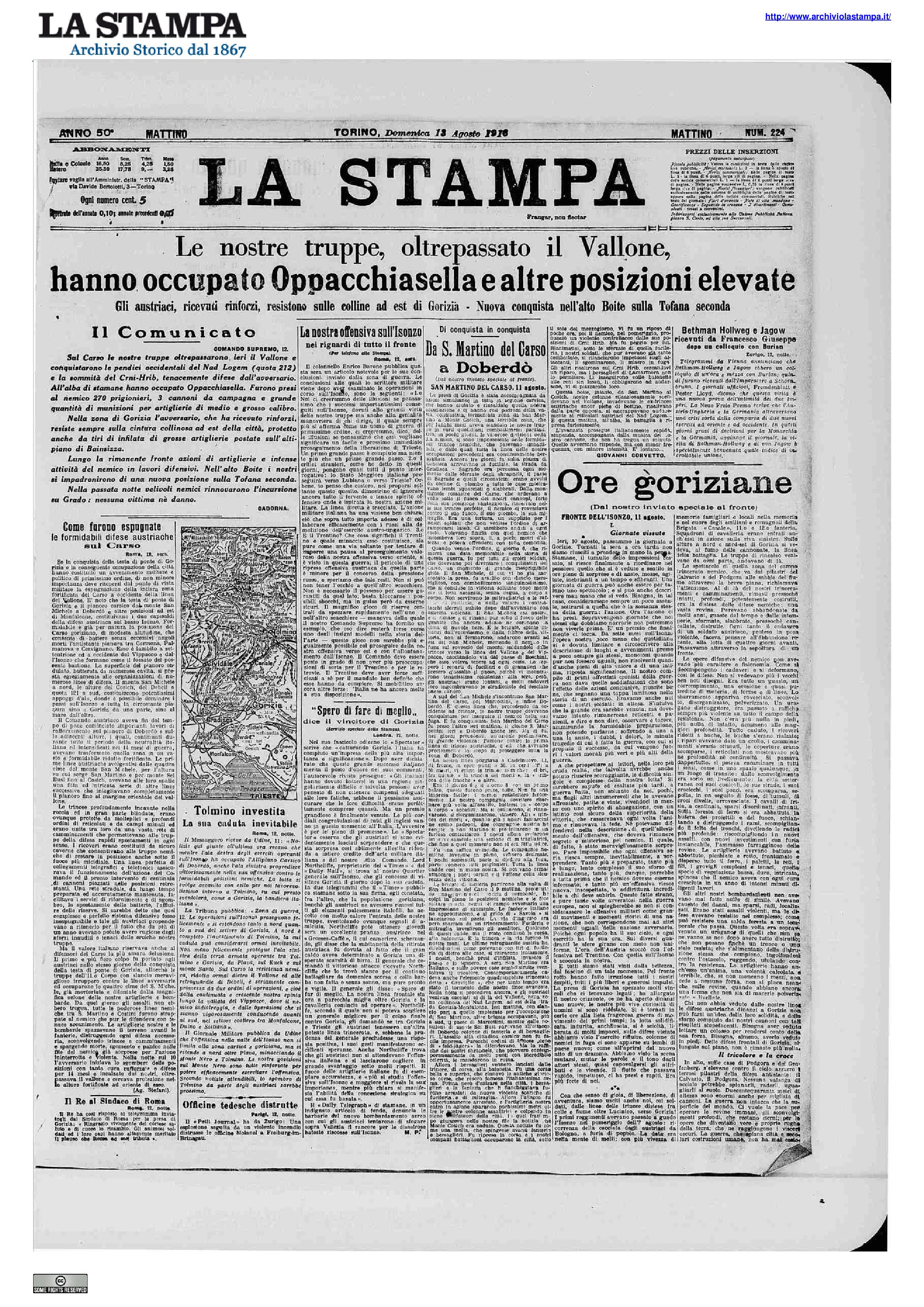 • Secondo un comunicato ufficiale dal 6 agosto a oggi gli italiani hanno fatto 15.393 prigionieri (331 ufficiali); presi anche 16 cannoni, numerose mitragliatrici e molto materiale.
