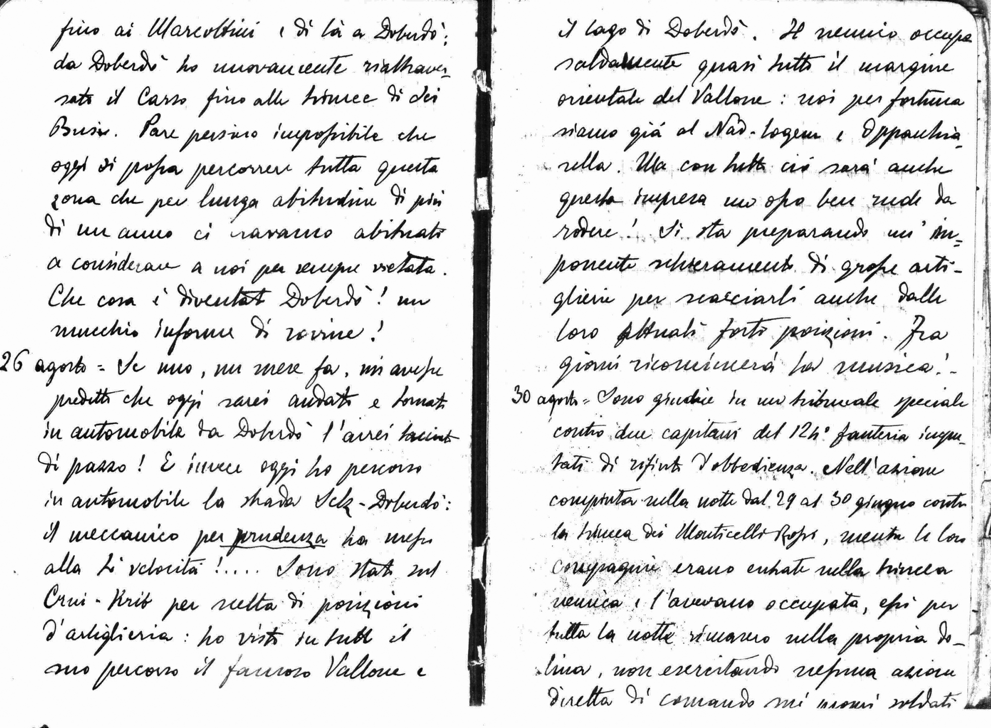 Sono giudice in un tribunale speciale contro due capitani del 124° fanteria inquisiti di rifiuto d’obbedienza. Nell’azione compiuta nella notte dal 29 al 30 giugno contro la trincea dei Monticelli Rossi, mentre le loro compagnie erano entrate nella trincea nemica e l’avevano occupata, essi per tutta la notte rimasero nella propria dolina, non esercitando nessuna azione diretta di comando sui propri soldati tanto che all’alba la trincea, in seguito ad un contrattacco del nemico dovette essere abbandonata. A mezzanotte ricevettero i due capitani l’ordine per iscritto dal proprio comandante di battaglione di raggiungere le proprie truppe; ma pare che essi non se ne siano dati per intesi!