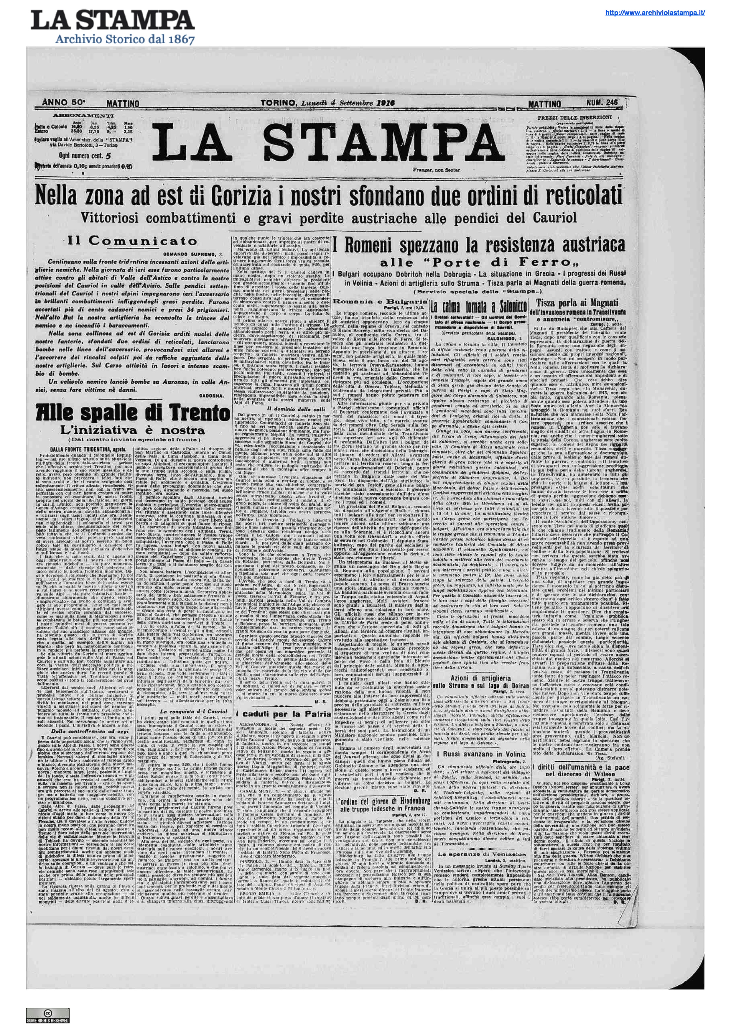 In Valle di Fiemme (Avisio) il nemico, ricevuti rinforzi, dopo intensa preparazione delle artiglierie, lanciò ieri due successivi violenti attaccchi contro le posizioni da noi conquistate sul Cauriol. Arrestato ogni volta dal nostro fuoco, fu contrattaccato alla baionetta e disperso dai valorosi alpini del battaglione Valle Brenta che inflissero all’avversario perdite assai gravi. Sulla rimanente fronte azioni delle artiglierie. La nostra eseguì tiri efficaci contro obiettivi di Valle Drava. Quella nemica fu particolarmente attiva nell’Alto But e nella zona di Plava (Medio Isonzo). Velivoli nemici lanciarono bombe su Ala e nelle Valli del torrente Vanoi (Cismon) e del torrente Mis (Cordevole). Non si ebbero vittime né danni. Albania: Nella giornata del 2 nostri riparti di bersaglieri e di milizia territoriale compivano una nuova brillante incursione sulla destra della Vojussa. Un riparto di bersaglieri lasciato sul Monte Trubes, vi restava indisturbato fino al pomeriggio del giorno 3, indi rientrava nelle nostre linee. Furono presi dal nemico 34 prigionieri, tutti regolari austriaci, e numerose casse di munizioni per artiglierie, di cartucce e di viveri.