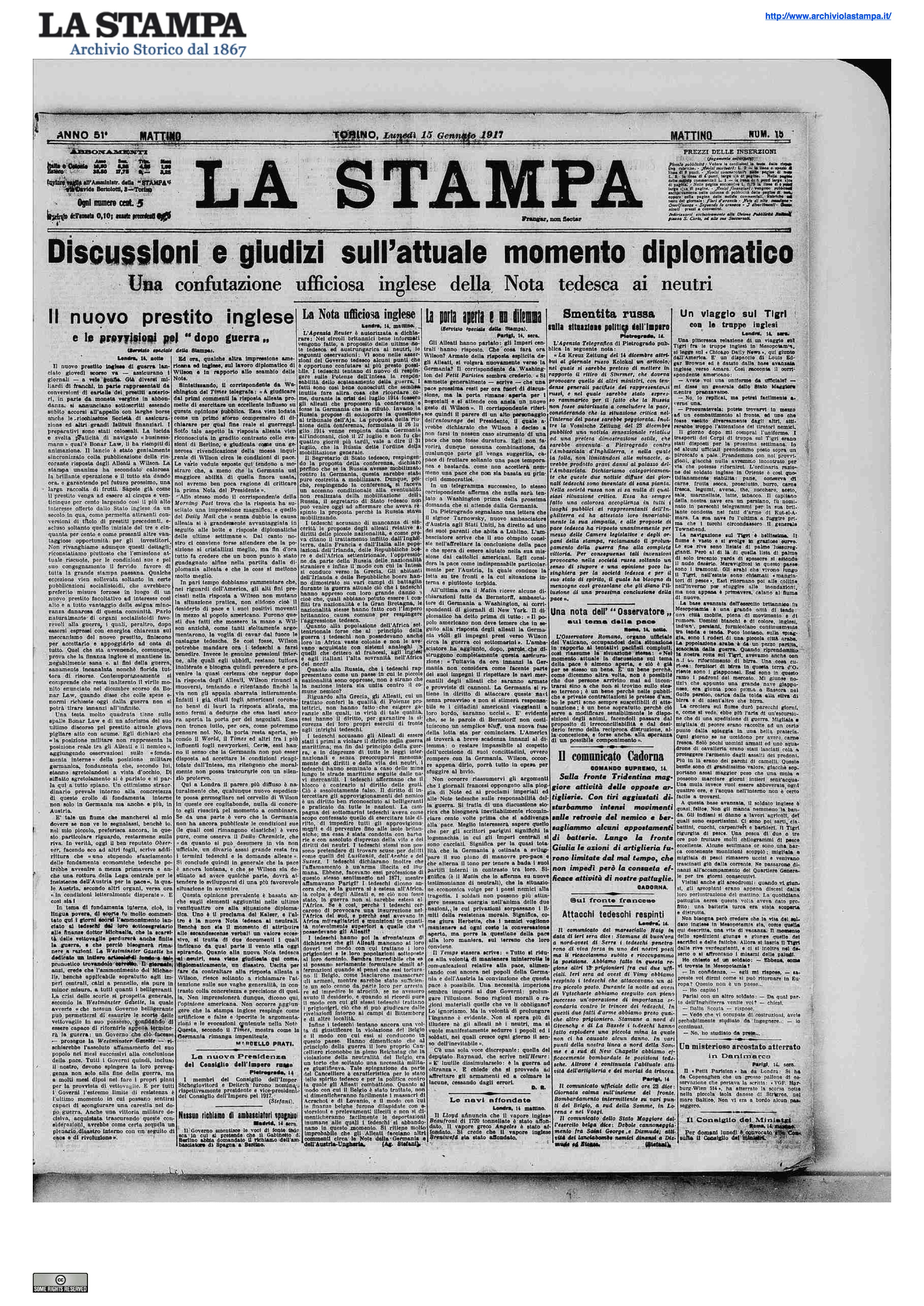 A svariati fusi orari di distanza i giornali americani riportano le dichiarazioni dell’Ambasciatore tedesco a Washington: «Il popolo americano non deve temere. Nonostante la risposta degli Alleati, la Germania non ha intenzione di violare gli impegni presi verso Wilson circa la guerra con i sottomarini». Parole di circostanza, tema del giorno: mentire fino all’ultimo. Berlino però non si riterrà responsabile delle vittime imbarcate su navi Alleate.